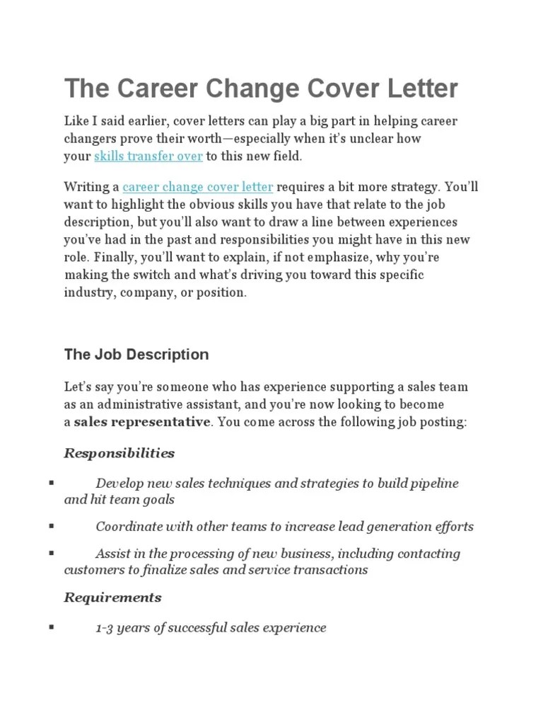 Emphasize your transferable skills · 2. How to write a career change cover letter · header (only for physical copies of your cover letter) · greeting · opening paragraph · body paragraph(s). Writing a cover letter that accompanies your resume for a specific position usually states your interest in the job as well as a statement or two that shows you've studied the organiza. Begin with your name and . In a career change cover letter, you're presenting your case for any employment gaps, as well as explanation as to why you're headed in a new direction. How to write a career change cover letter · 1. Highlight your superior performance in previous . Tips for writing a career change cover letter · 1.