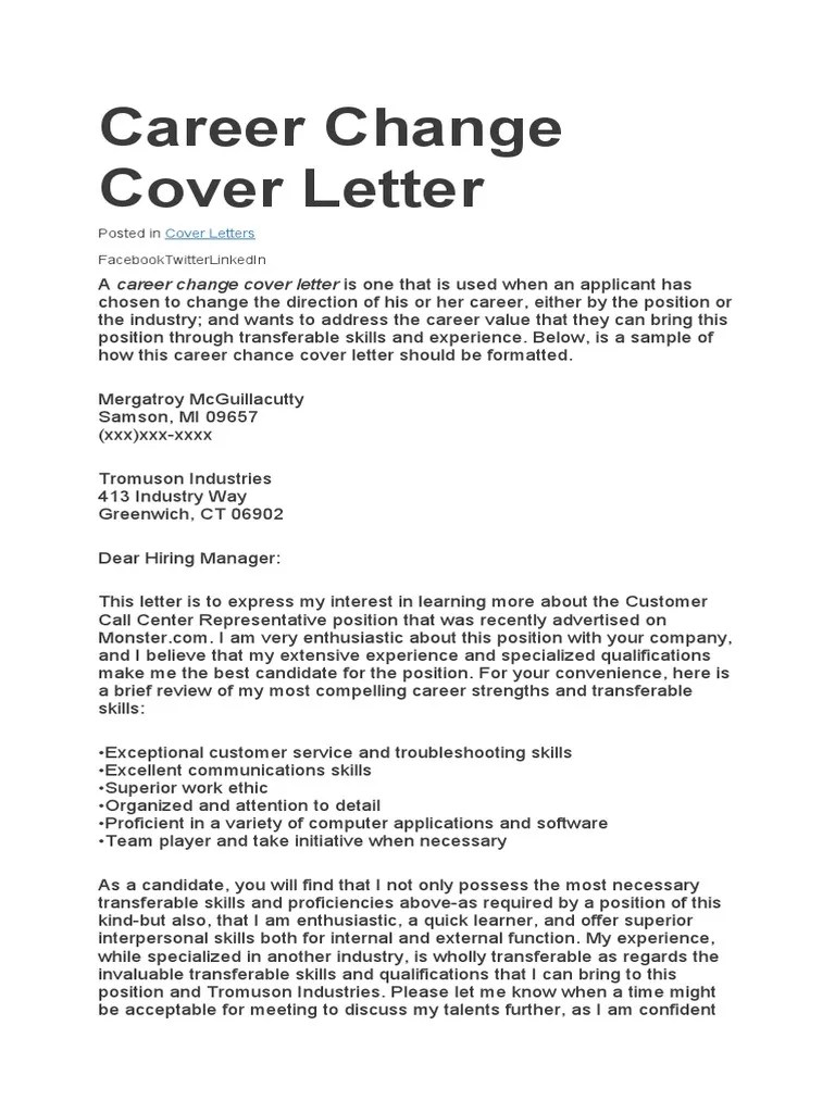 .Writing a cover letter is essential when applying for jobs. In a cover letter explaining a career change, you first need to introduce yourself and express enthusiasm for the role. Adding a cover letter can help you highlight important messages and build a conversation with the employer before the opportunity to s. Emphasize your transferable skills · 2. Discuss transferable skills · 3.