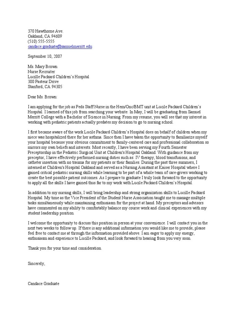 Writing a cover letter is essential when applying for jobs. Offering excellent critical thinking skills and the crucial ability to remain calm in stressful situations, i would appreciate the opportunity . Get expert advice and new grad nursing cover letter examples. With this cover letter and resume, i am applying today for the pediatric nurse position i heard that you are hiring for at stanford hospital and clinics. If youâre interested in pursuing a trusted, compassionate career in health care, you might be wondering âwhat do i need to become a nurse?â though not necessarily as time consuming as becoming a doctor, becoming a nurse does require specifi. I am sending this application for the position of pediatric nurse in your hospital in reference to the advertisement posted in fvt employment news, dated august . A cover letter should accompany your resume, and offer a brief summary of the job you're applying to and your qualifications . As a skilled pediatric nurse with extensive experience . (registered nurse), you should always include a cover letter aimed at getting you considered for the position over any of the other qualified applicants looking for the same job. When applying for a position as an r.n. In addition to my experience and personal qualities, i have a solid educational foundation and a passion for pediatric care. In this guide, i list 20 top resources about pediatric nurse cover letter. The attached resume is proof of my qualifications and interest in this regard.